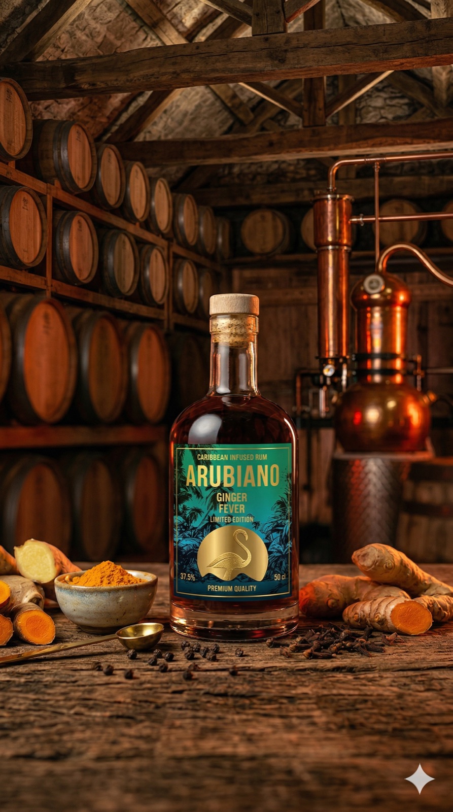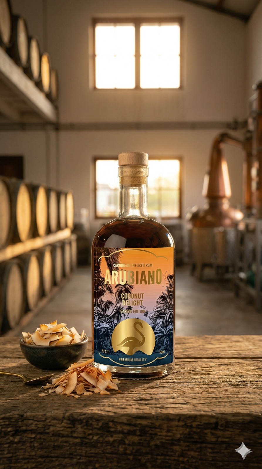 Chaque bouteille d'Arubiano est un Flamingo Cask Blend — un assemblage unique où le rhum de base rencontre des arômes naturels soigneusement sélectionnés. Ce n'est pas un rhum arrangé. Ce n'est pas un rhum aromatisé. C'est un rhum pensé. Le caramel brun du Coconut Delight n'est pas ajouté — il naît de la torréfaction lente de la noix de coco. Le piquant du Ginger Fever ne brûle pas — il réchauffe. La vanille du Vanilla Tonka Dream ne sucre pas — elle enveloppe. Le Roasted Pineapple ne masque pas — il explose.